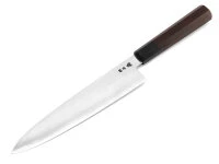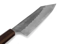 , bietet ein hervorragendes Schärfepotenzial. Der Schneidkern besteht aus Aogami Super, dem blauen Papierstahl. Der Stahl ist ein echter japanischer Kohlenstoffstahl und kann sehr hart geschmiedet werden. Er zeichnet sich durch feinstes Martensit – metastabiles Gefüge – aus, das für höhere Härte und eine ausgezeichnete Schärfe sorgt. Ein weiterer Vorzug ist, dass Aogami super trotz hoher Härte leicht geschliffen werden kann und aufgrund des hohen Anteils von Wolfram eine sehr gute Standfestigkeit zeigt. Mit diesem Schneidkern bieten die Messer dieser Serie also eine außergewöhnlich hohe Schärfe, Schneidleistung und Beständigkeit.