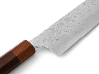 Diese Damastmesser haben eine Klinge aus dem beliebten Edelstahl VG-10 als Schneidlage, die von Damaststahl umhüllt ist. Der obere Teil der Klinge ist mit einem schönen und nützlichen Hammering ausgestattet. Im unteren Teil verlaufen die schönen Linien des Damaststahls. Die zweiseitig geschliffene Klinge – für Rechts- und Linkshänder – wurde zum Abschluss poliert. Außergewöhnlich ist der Griff aus Eichenholz, der hervorragend in der Hand liegt und zur Klinge hin leicht abgeflacht ist.
