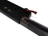 Sicherer Klingenschutz für das Damastmesser Zuiun (Kiwami) Sujihiki 240, 62 Lagen. Der Klingenschutz ist aus Hartkunststoff gefertigt und verfügt über einen Sicherungsstift. Länge ca. 28 cm
